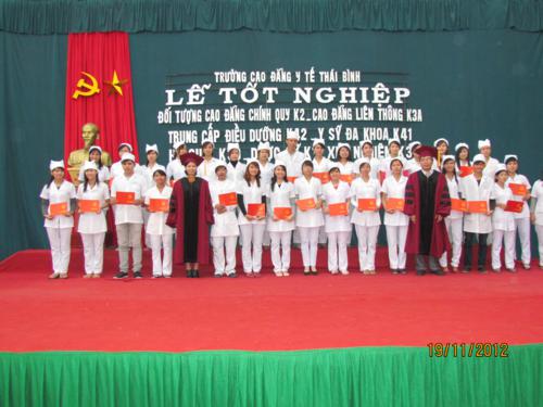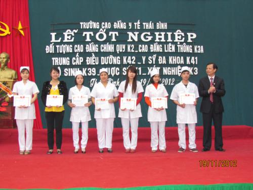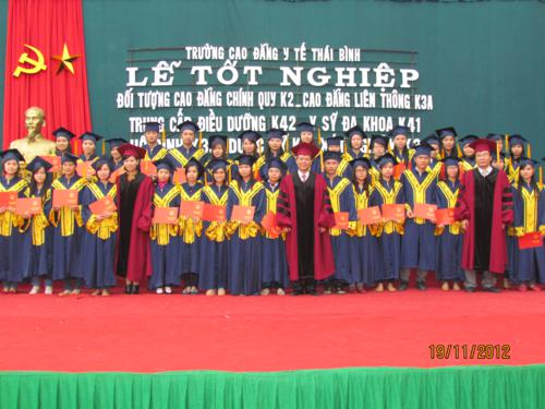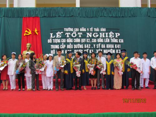 Sáng ngày 19/11/2012 Trường Cao đẳng Y tế Thái Bình đã long trọng tổ chức Lễ công nhận và trao bằng tốt nghiệp cho 262 sinh viên Cao đẳng điều dưỡng và 625 học sinh trung cấp Điều dưỡng K42, Y sỹ đa khoa K41, trung cấp hộ sinh K39, trung cấp dược K1, trung cấp xét nghiệm K3.