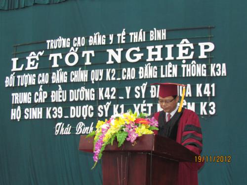Tiến sĩ Phạm Quang Hòa – Bí thư Đảng ủy, Hiệu trưởng Nhà trường đã phát biểu chúc mừng, dặn dò và giao nhiệm vụ cho các tân cán bộ y tế mới tốt nghiệp. Thầy hiệu trưởng mong các em sớm có được việc làm dù ở cơ sở y tế công lập hay ngoài công lập hay đi làm việc ở nước ngoài, các em hãy mang hết kiến thức kỹ năng đã được học để phục vụ, chăm sóc người bệnh tận tình; đồng thời các em cần phải tiếp tục học tập lên trình độ cao hơn và các lớp bồi dưỡng chuyên môn để không bị lạc hậu, có như thế mới đáp ứng được nhu cầu chăm sóc sức khỏe ngày càng cao của nhân dân.