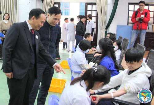 Đồng chí Vũ Đức Điến, Chủ tịch Hội Chữ thập đỏ và TS. Nguyễn Thanh Sơn, Phó Bí thư Đảng ủy, Phó hiệu trưởng nhà trường động viên người hiến máu