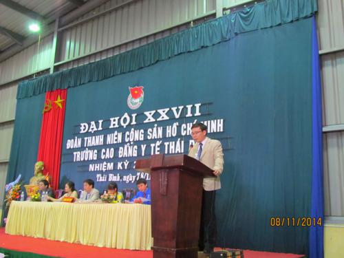 Thay mặt Đảng ủy, Ban Giám hiệu nhà trường phát biểu chỉ đạo tại Đại hội, Thạc sỹ Nguyễn Thanh Sơn - Phó Bí thư Đảng Ủy, Phó Hiệu trưởng nhà trường đánh giá cao những thành quả mà đoàn viên thanh niên nhà trường đã đạt được trong nhiệm kỳ 2012 - 2014 và mong muốn BCH Đoàn trường Cao đẳng Y tế Thái Bình khóa XXVII, nhiệm kỳ 2014 - 2015 sẽ lãnh đạo, chỉ đạo công tác Đoàn và phong trào thanh niên nhà trường đảm bảo luôn giữ gìn và phát huy truyền thống quý báu mà các thế hệ nhà trường đã gây dựng, bám sát nhiệm vụ chính trị của nhà trường trong giai đoạn mới để hoàn thành mục tiêu phương hướng đã đề ra. Nhân dịp này Thạc sỹ Nguyễn Thanh Sơn đã cảm ơn sự quan tâm, chỉ đạo của Ban thường vụ Tỉnh đoàn Thái Bình đối với sự phát triển của tổ chức Đoàn và phong trào thanh niên nhà trường.