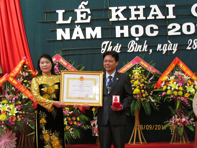 Với những đóng góp to lớn cho sự phát triển của nhà trường, tại lễ Khai giảng, thừa lệnh của Chủ tịch nước, đồng chí Cao Thị Hải trao tặng Huân chương Lao động hạng Ba, phần thưởng cao quý của nhà nước cho Thạc sĩ Phạm Quang Hòa, Bí Thư Đảng ủy, Hiệu trưởng nhà trường.