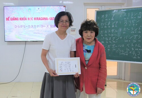TS. Aono Junko, Giám đốc tổ chức NPO - tổ chức hỗ trợ điều dưỡng viên, nhân viên chăm sóc người nước ngoài tại Nhật Bản trao chứng chỉ hoàn thành khóa học cho học viên