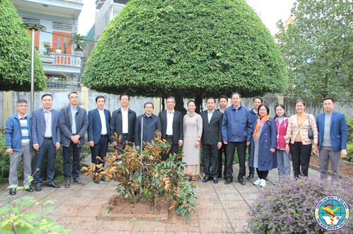 Đoàn công tác chụp ảnh lưu niệm cùng cán bộ Nhà trường trước vườn cây thuốc nam và đại sảnh
