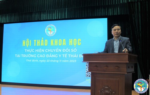 Sáng ngày 23/11/2023, Trường Cao đẳng Y tế Thái Bình tổ chức Hội thảo khoa học Thực hiện chuyển đổi số tại Trường Cao đẳng Y tế Thái Bình với mục đích giới thiệu về chuyển đổi số và ứng dụng công nghệ thông tin trong hoạt động quản lý và dạy học trong các cơ sở giáo dục; giới thiệu mô hình chuyển đổi số giáo dục đại học hiện nay và mô hình chuyển đổi số phù hợp với đặc thù, mục tiêu, định hướng phát triển của các trường cao đẳng, đại học trên địa bàn tỉnh Thái Bình; trao đổi, chia sẻ kinh nghiệm trong quá trình chuyển đổi số tại Trường Cao đẳng Y tế Thái Bình.