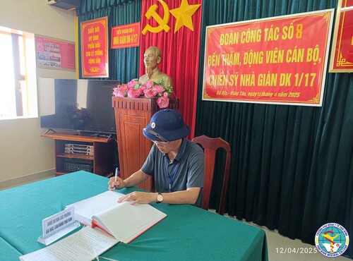 Đồng chí Nguyễn Đình Trọng, Trưởng đoàn công tác Khối thi đua các trường Đại học, Cao đẳng tỉnh Thái Bình viết sổ lưu niệm tại Nhà giàn DK1-17