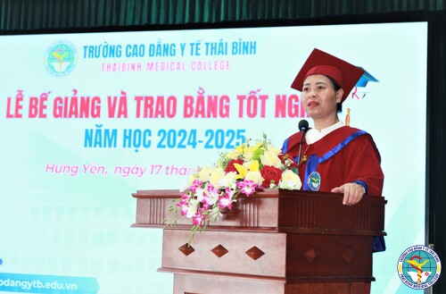 Trong không khí trang trọng và ấm áp, TS. Nguyễn Thị Thu Dung, Hiệu trưởng nhà trường, đã có bài phát biểu đầy cảm xúc. Cô không chỉ chúc mừng thành công của các tân cử nhân mà còn chia sẻ về tầm nhìn mới của Trường Cao đẳng Y tế Thái Bình – nơi duy nhất trong cả nước có Bệnh viện đa khoa ngay trong khuôn viên trường. Với khát vọng xây dựng một "Trường học thông minh, Bệnh viện thông minh", nhà trường đang nỗ lực từng ngày để trở thành đơn vị vững chắc cho những thế hệ cán bộ y tế tương lai. Mong rằng các em sẽ luôn trân trọng và mang theo những ký ức đẹp nhất về ngôi nhà thứ hai này, nơi đã ươm mầm cho những hoài bão cao cả của các em.