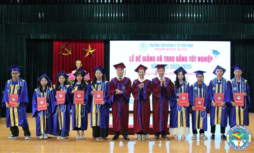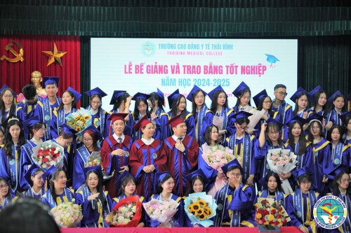 Sáng ngày 17/9/2025, tại Trường Cao đẳng Y tế Thái Bình, 107 tân cử nhân Cao đẳng điều dưỡng K15, Kỹ thuật Vật lý trị liệu - Phục hồi chức năng K2 và Cao đẳng Kỹ thuật xét nghiệm y học K9 đã bước lên bục vinh quang, đón nhận tấm bằng tốt nghiệp, đánh dấu sự kết thúc ngọt ngào của một hành trình đầy nỗ lực và đam mê. Buổi lễ không chỉ là sự kiện trao bằng, mà còn là khoảnh khắc thăng hoa của tri thức, nơi những trái tim y đức được chắp cánh để bay cao, bay xa.