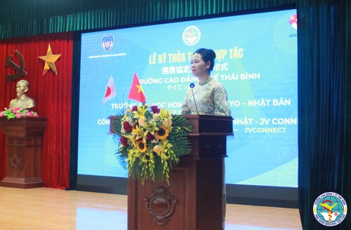 Phát biểu chào mừng tại buổi ký kết, TS. Nguyễn Thị Thu Dung, Bí thư Đảng ủy, Chủ tịch Hội đồng trường, Hiệu trưởng bày tỏ, trong những năm qua, Trường Cao đẳng Y tế Thái Bình luôn nhận đươc sự quan tâm, đánh giá cao của Lãnh đạo Bộ, Lãnh đạo tỉnh và các đơn vị bạn trong việc thực hiện các chương trình hợp tác quốc tế về đào tạo, phát triển nhân lực khối ngành sức khỏe. Nhật Bản là một trong những quốc gia có nhiều đối tác uy tín, có sự hợp tác phát triển hiệu quả của Nhà trường. Ngày hôm nay, Trường Cao đẳng Y tế Thái Bình rất trân trọng cho sự hiện diện của các vị Lãnh đạo của Trường Đại học Hokkaido Nhật bản và Công ty Cổ phần tư vấn kết nối Việt Nhật - JV Connect là những đơn vị tiếp theo mà chúng tôi hi vọng sẽ giúp mở rộng, kéo dài chuỗi thành công trong hợp tác Nhật Bản của Trường Cao đẳng Y tế Thái Bình. Sự kết hợp giữa hai đơn vị lần này sẽ mang lại kết quả tốt đẹp và hy vọng mang lại cho các sinh viên Việt Nam cơ hội tiếp cận được chương trình học tập và làm việc tại Nhật Bản, phát triển bản thân góp phần xây dựng đất, tạo nên được sự tin tưởng từ các đơn vị, trong đó có Trường Cao đẳng Y tế Thái Bình.