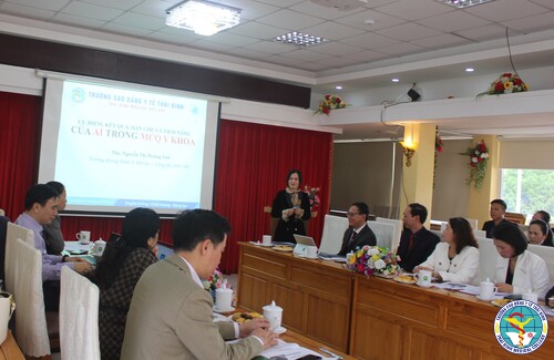 Ths. Nguyễn Thị Hoàng Anh, Trưởng phòng QLĐT - CTSV Trường Cao đẳng Y tế Thái Bình trình bày "Ưu điểm, kết quả, hạn chế và tiềm năng của AI trong MCQ y khoa"