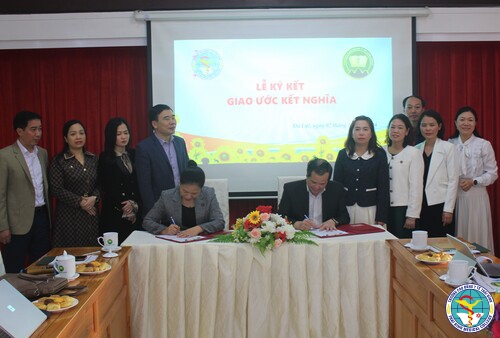 TS. Nguyễn Thị Thu Dung, Bí thư Đảng ủy, Chủ tịch Hội đồng trường, Hiệu trưởng Trường Cao đẳng Y tế Thái Bình và Ths. Lý Duy Hưng, Phó Hiệu trưởng phụ trách trường Cao đẳng Y tế Lâm Đồng ký kết giao ước kết nghĩa