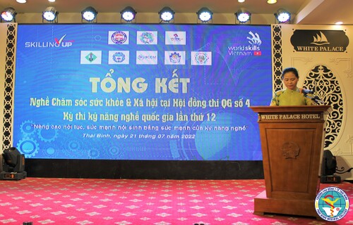 Phát biểu tại buổi Lễ tổng kết, TS. Nguyễn Thị Thu Dung, Phó Chủ tịch Hội đồng thi quốc gia số 4, Bí thư Đảng ủy, Hiệu trưởng nhà trường đã báo cáo công tác chuẩn bị và tổ chức của Hội đồng thi quốc gia số 04 - Nghề thi Chăm sóc sức khỏe và xã hội. Sau 4 ngày tranh tài, Kỳ thi Kỹ năng nghề quốc gia lần thứ 12 tổ chức tại Trường Cao đẳng Y tế Thái Bình đã thành công tốt đẹp. Kỳ thi diễn ra theo đúng kế hoạch, đảm bảo đúng quy chế, chính xác, minh bạch và công bằng. Qua đó, TS. Nguyễn Thị Thu Dung đặc biệt gửi lời cảm ơn tới lãnh đạo Bộ Lao động - Thương binh và Xã hội, lãnh đạo các Bộ, ngành, UBND tỉnh Thái Bình, Sở Lao động - Thương binh và Xã hội, Sở Y tế, các trường có thí sinh dự thi và các cơ quan báo đài đã dành sự quan tâm, chỉ đạo kỳ thi thành công tốt đẹp.