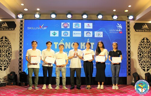 Ông Nguyễn Chí Trường, Vụ trưởng Vụ Kỹ năng nghề và ông Nguyễn Thế Hiếu, Phó vụ trưởng Vụ tổ chức cán bộ, Bộ Công thương trao quà và giấy chứng nhận cho Thí sinh đạt giải phụ Kỳ thi