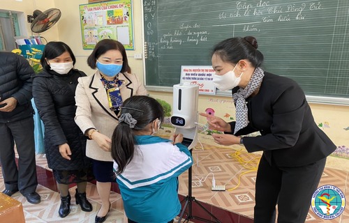 Tại buổi lễ tiếp nhận, TS. Nguyễn Thị Thu Dung, Hiệu trưởng Trường Cao đẳng Y tế Thái Bình đã trao tặng máy đo thân nhiệt sát khuẩn tự động không tiếp xúc và dung dịch sát khuẩn tay cho Trường tiểu học Quỳnh Hội.