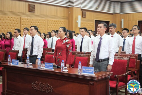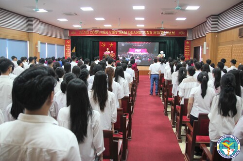 BGH cùng toàn thể cán bộ, giảng viên, và đại diện sinh viên cùng cất vang tiếng hát Quốc ca, đồng lòng hướng về Lễ kỷ niệm 80 năm truyền thống vẻ vang