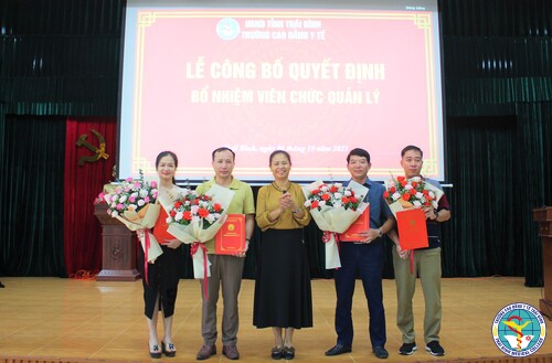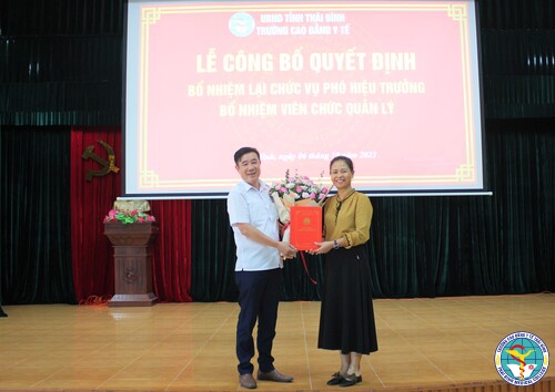 Mở đầu buổi sinh hoạt chuyên môn, đại diện Phòng Tổ chức cán bộ đọc Quyết định về việc kiện toàn cơ cấu tổ chức của Trường Cao đẳng Y tế Thái Bình, kiện toàn tổ chức bộ máy của Nhà trường, xây dựng chức năng, nhiệm vụ, chế độ làm việc của bộ phận, xây dựng vị trí việc làm, chức trách cá nhân trình Hiệu trưởng phê duyệt. Đồng thời công bố Quyết định bổ nhiệm lại chức vụ Phó Hiệu trưởng cho BSCKII. Nguyễn Đình Trọng và bổ nhiệm lại viên chức quản lý Phòng Tổ chức cán bộ cho Ths. Bùi Văn Kiên; Phòng Quản lý đào tạo - Công tác sinh viên cho Ths. Nguyễn Thị Hoàng Anh; Phòng Hành chính - Quản trị cho Ths. Phạm Anh Tuấn; Phòng Khảo thí và đảm bảo chất lượng cho Ths. Lê Văn Dũng.