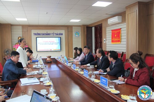 Phát biểu chào mừng đoàn công tác, TS. Nguyễn Thị Thu Dung, Bí thư Đảng ủy, Chủ tịch Hội đồng trường, Hiệu trưởng, Giám đốc Bệnh viện đa khoa Trường cho biết, Trường Cao đẳng Y tế Thái Bình là một trong những đơn vị có đơn vị Bệnh viện đa khoa trong Nhà trường và là đơn vị trường duy nhất tự chủ tài chính của đơn vị sự nghiệp công lập. Nhà trường đang thực hiện việc đào tạo theo địa chỉ. Trường đang được chuỗi Bệnh viện thuộc tập đoàn TTH Group đặt hàng. Với đối tượng Y sĩ trung cấp vẫn đang đào tạo, Cao đẳng Y sĩ sang năm 2026 có khóa tốt nghiệp đầu tiên nên việc liên thông từ cao đẳng là hết sức cần thiết trong nhu cầu hiện nay.