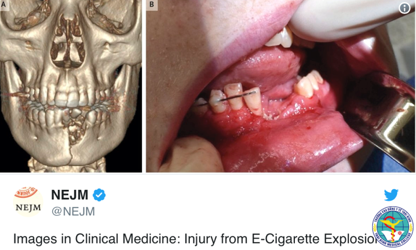 Đã ghi nhận các trường hợp cháy nổ khi sử dụng thuốc lá điện tử khi các thiết bị trong thuốc lá điện tử có thể hỏng, lỗi và gây tổn thất tài sản và các chấn thương nghiệm trọng vùng đầu, mặt, cổ, mắt, mũi, xương hàm. Theo tạp chí New England Journal of Medicine đã ghi nhận trường hợp Một pin thuốc lá điện tử nổ trong miệng cậu bé 17 tuổi khiến thanh niên này phải phẫu thuật cố định xương, loại bỏ răng và mô hỏng, bị tổn thương nặng xương hàm trái.