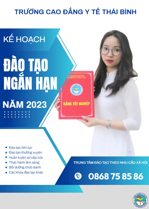 Thực hiện kế hoạch đào tạo, bồi dưỡng năm 2023 và nhu cầu học tập, công tác của người học. Trung tâm Đào tạo theo nhu cầu xã hội, Trường Cao đẳng Y tế Thái Bình xin gửi đến Quý cơ quan, đơn vị và học viên Danh mục các khóa học đào tạo ngắn hạn của Trường để Quý cơ quan, đơn vị, học viên được biết và phối hợp thực hiện.